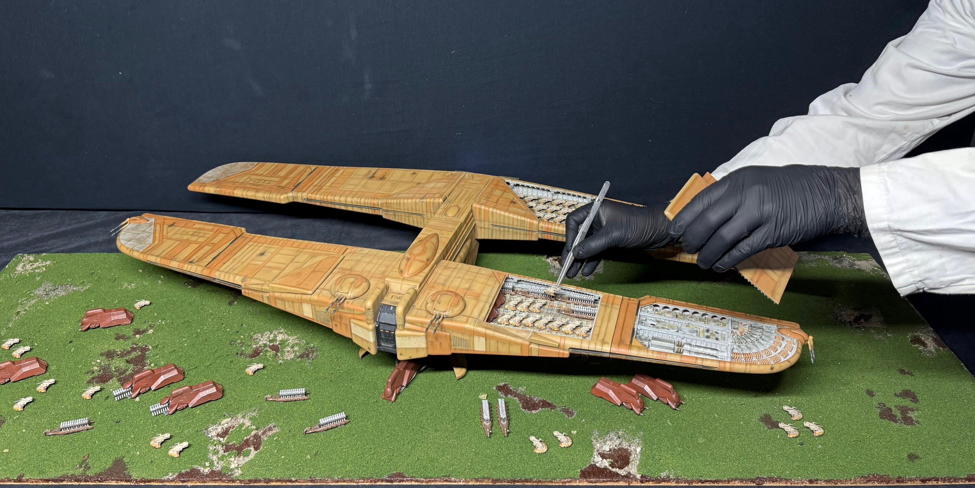 C-9979s are stored in the hangars of warships where they are assembled, maintained, and repaired. When ready for deployment, ground vehicles board the craft for transport to the battlefield.
